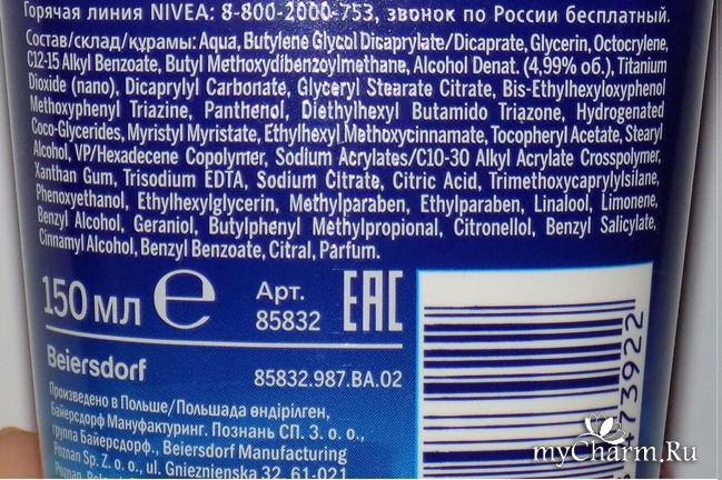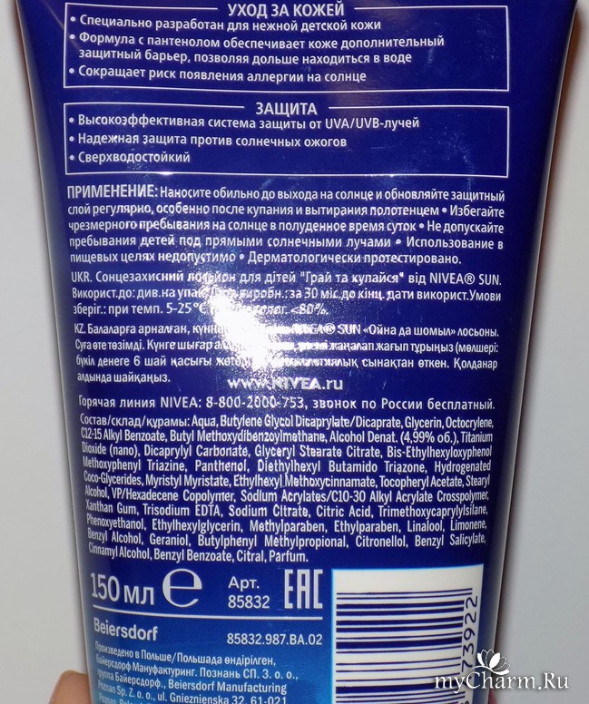 Оформление тубы в красивых синих тонах – это фишка бренда Нивея. Крышечка ярко-желтая, прекрасное напоминание о лете. На фронтальной стороне продукта изображены мальчик и девочка, играющие в мяч в воде. Стоит ли говорить, что мой ребенок с удовольствием пользовался средством «для активных девочек и мальчиков»? Даже уговаривать не пришлось.