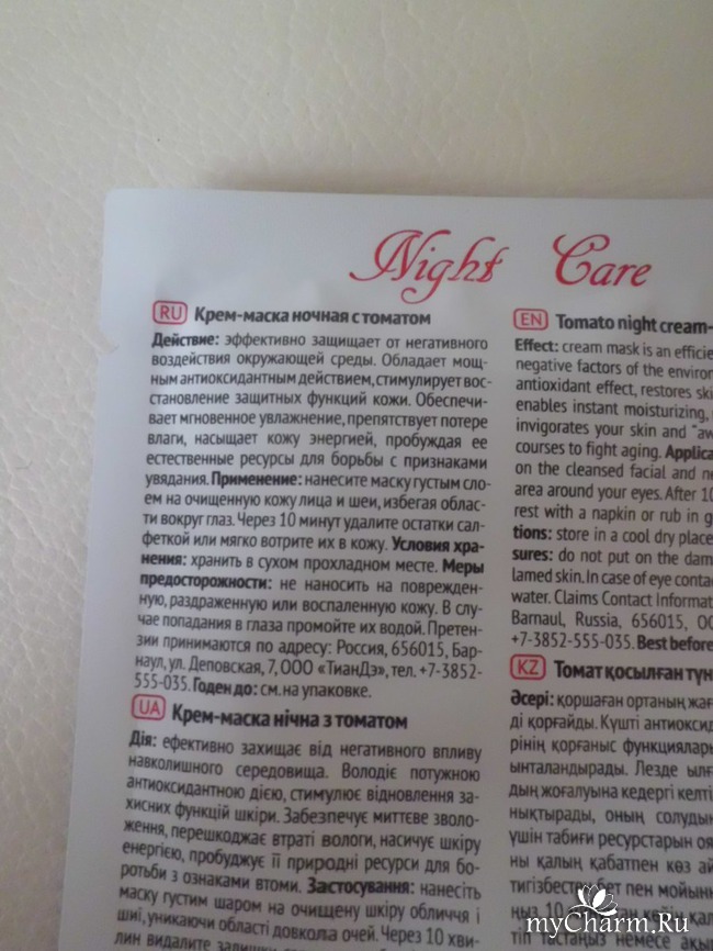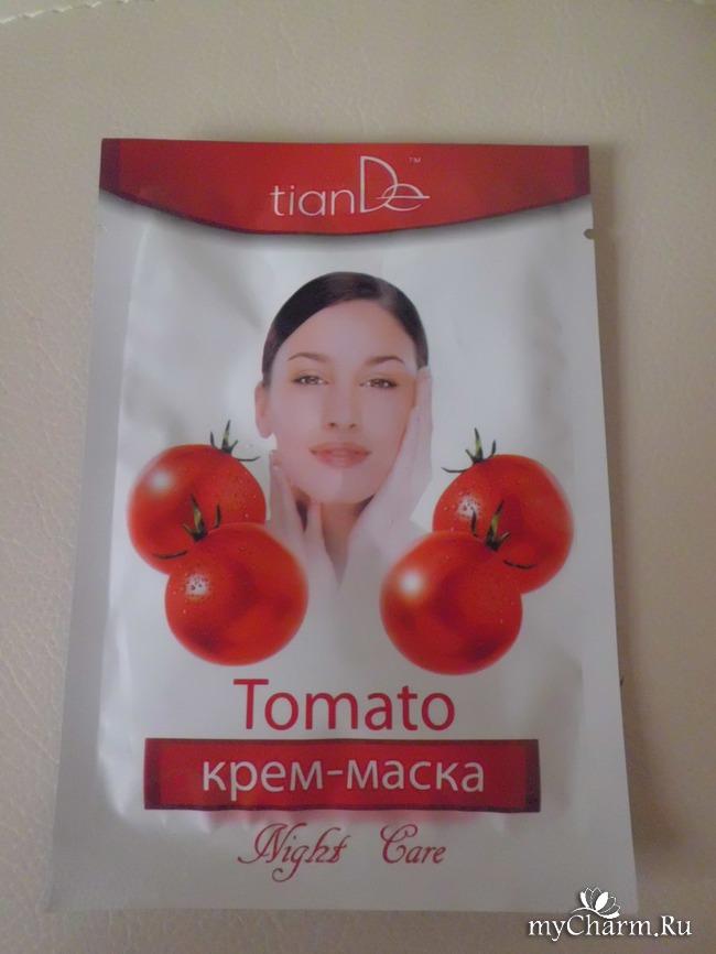Писала я как-то обзоры про крем-маски от компании ТианДе. Вот здесь обзор про черничную маску: https://www.mycharm.ru/kosmetika/obzory/chernichnoe-lakomstvo-dlya-lica/, а здесь – про маску с зеленым чаем: https://www.mycharm.ru/kosmetika/obzory/zelenyj-chaj-podarit-kozhe-svezhest/. Они удобны в применении: их наносишь перед сном на 10 минут, затем удаляешь остатки бумажной салфеткой или втираешь в кожу. И ничего не нужно смывать. Сегодня расскажу о третьей маске, которая у меня лежала больше месяца и я никак не могла его протестировать. Знакомьтесь, перед Вами крем-маска «Tomato Night Care». Маски с томатом обладают детокс-эффектом, поэтому я и купила это средство.