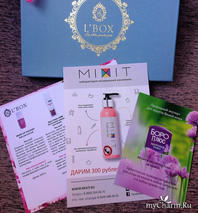 В бьюти-бокс были вложены рекламные листовки (со скидкой на косметику MIXIT и рекламой нового крема БОРО плюс), а так же вкладыш с описанием состава коробочки.