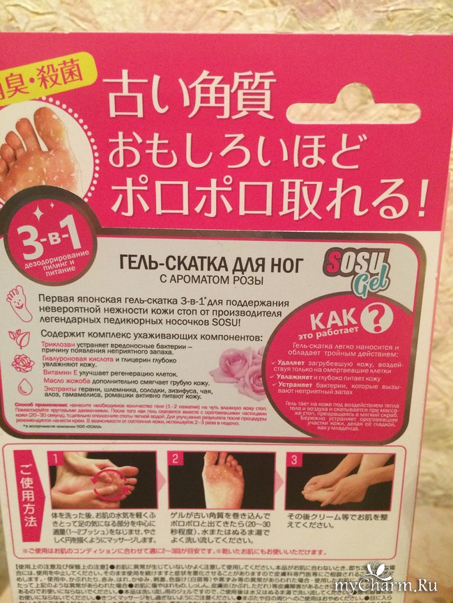 Гель-скатка в первую очередь необходима для очищения кожи стоп, причем она не просто очистит, но еще и удалит огрубевший эпидермис. Но сразу скажу, что сильно загрубевшую кожу не возьмет. С мозолями, натоптышами справятся носочки от этого же производителя. Важный момент в средстве так же заключается в устранении бактерий, которые и создают неприятный запах. Помимо этого, ваша кожа будет увлажнена и напитана полезными веществами. Все это мы можем увидеть на коробке с продуктом.