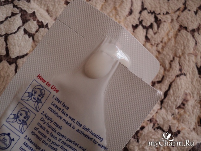 При нанесении на увлажненную водой кожу маска моментально нагревается, и в считанные секунды начинает активно действовать, глубоко очищая покров и насыщая его живительной влагой, словно после похода в сауну. В общем, оптимальный вариант для обладательниц сухой кожи, каковой являюсь я. Кстати, процесс применения маски занимает минимум времени, после нанесения и массажа необходимо подождать ровно 1 минуту. Даже за такое короткое время маска успевает нагреться, а на коже чувствуется приятное тепло.