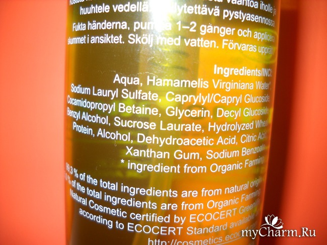 Все компоненты в составе пенки имеют на 99,5% органическое происхождение, при этом около 5% данных компонентов были выращены с применением ценнейших методов органического земледелия.