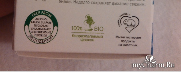 Флакон сделан из биоразлагаемой пластмассы. Также этот продукт не тестировался на животных. Все это видно на фото ниже. Приятна такая забота производителей об окружающей среде.