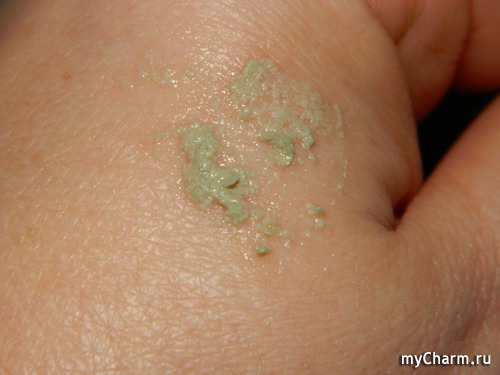 На упаковке цвет маски близок к бирюзовому, на деле же он серовато-зелёный, не насыщенный. По консистенции средство напоминает пластилиновую массу из-за большого содержания глины. Аромат лёгкий с мятными нотками. Здесь должна сказать, что у меня средство получилось с не выраженным ароматом, скорее всего, по вине заморозки продукта. Просто потому, что все остальные девочки как раз таки говорили о насыщенном запахе эфирных масел, да и сам производитель подчёркивает, что время процедуры может стать и аромасеансом.