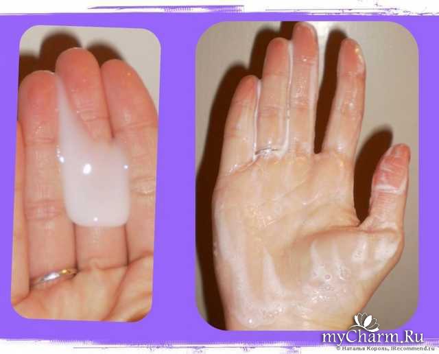 Консистенция средства гелеобразная, белого непрозрачного цвета. Гель очень хорошо пенится, поэтому если вы выдавили больше средства на руки, то понадобится много воды, чтобы смыть гель. Пена такая видимо за счет содержания СЛС.