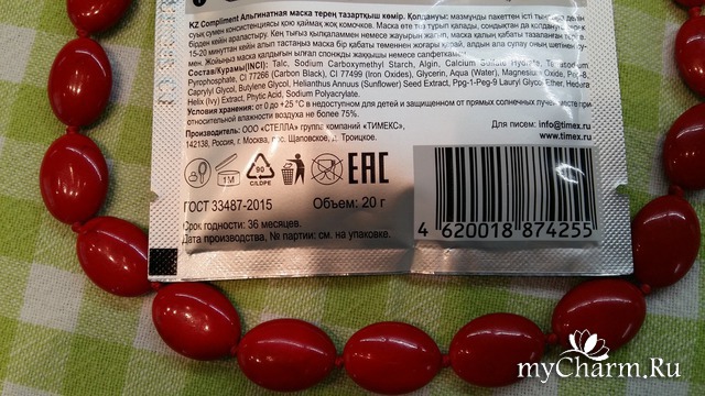 На обратной стороне пакетика можно ознакомиться с составом маски. Изготовлена масочка по ГОСТу в Москве ООО"Стелла" группой компаний "ТИМЕКС". Объем 20 грамм, хранить масочку можно целых 36 месяцев при соблюдении условий хранения.