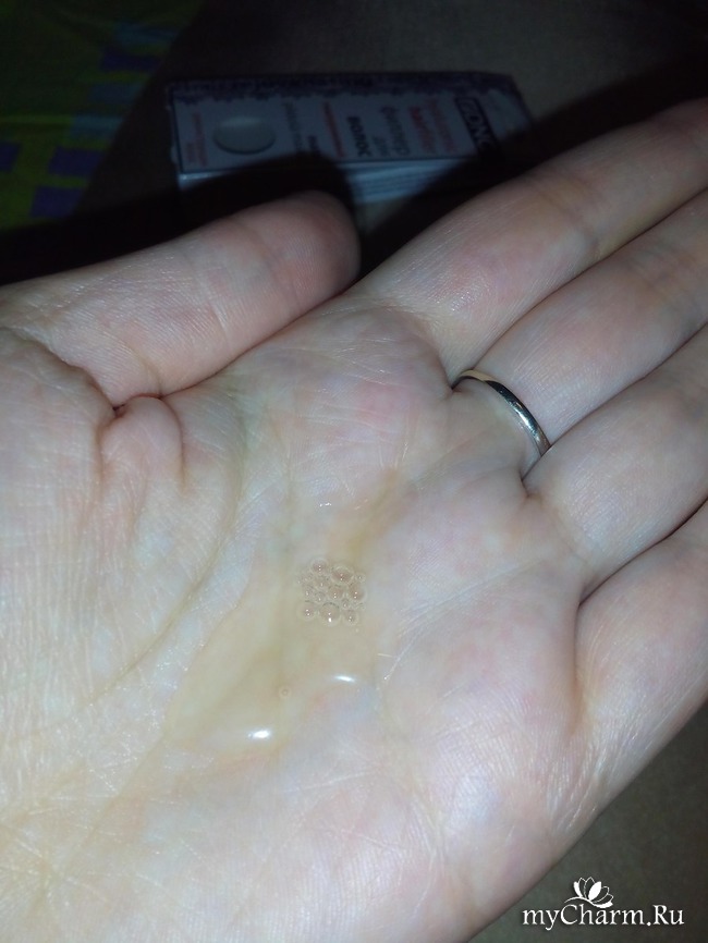 Жидкость прозрачная, слегка желтоватого оттенка. Консистенция жидкая. На ощупь не липкая и не жирная - вода водой. Запах имеет слабый, едва уловимый, описать не могу, но точно не противный и не отталкивает.