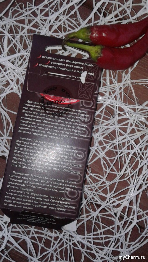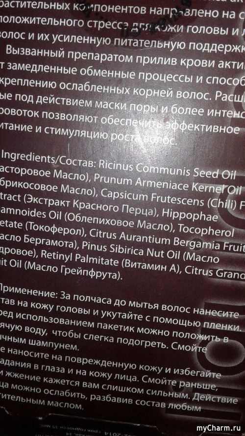 Немудрено, что маска оказывает на волосы такое великолепное действие, ведь в её составе много ценных для волос масел: абрикосовое, касторовое, облепиховое, кедровое, бергамота, грейпфрута и, конечно же, красного перца. DNC постарался на славу!