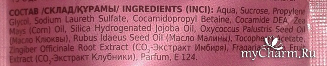 Скрабирующие частицы у "Ягодного Совершенства" ярко - розового цвета, и довольно - таки крупные: отчетливо видны крупинки сахара и ягод! И это не удивительно, так как в составе помимо сахара присутствуют клубника, клюква, имбирь, масло семян малины, а также гранулы жожоба.