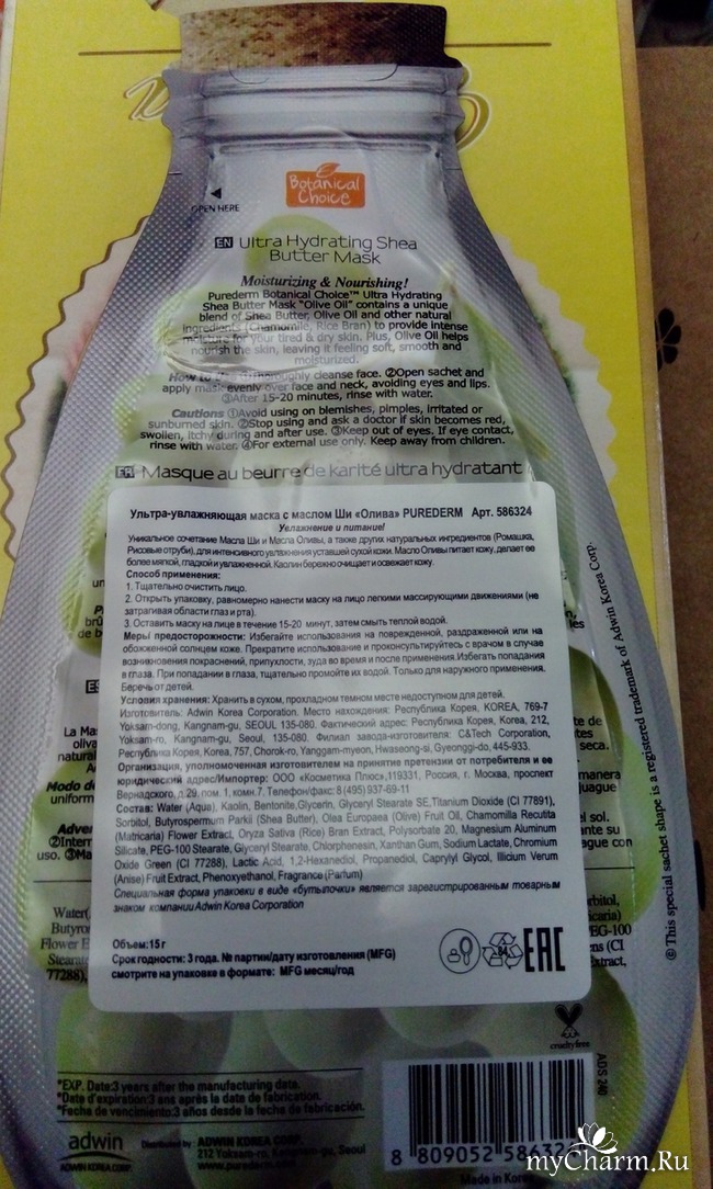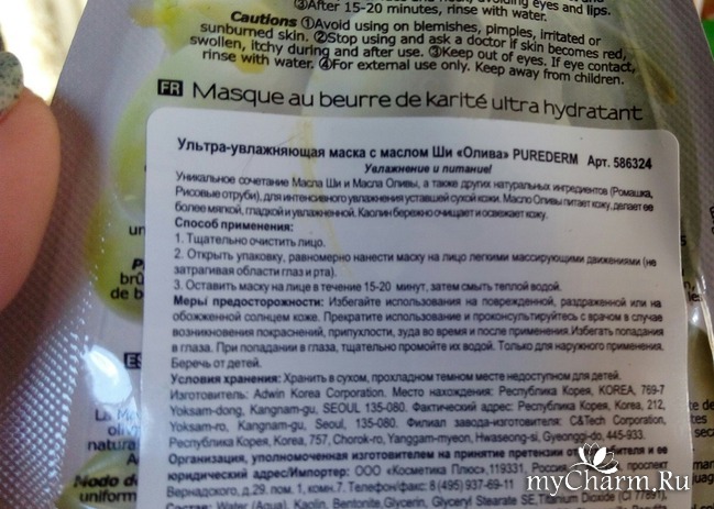 Вся необходимая информация представлена в полном объёме. Например, те же меры предосторожности: маску нельзя наносить на кожу с различными раздражениями и повреждениями, а также (как бы ни было сильно желание применения из-за прописанного эффекта «ультра-увлажнение») и на обгоревшую на солнце кожу. Даже советуют обратиться к врачу при возникновении какого-либо раздражения или зуда после применения маски. Ну и естественно, что нужно исключить попадание маски в глаза.