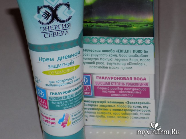 Вот в этом и уникальность серии «Энергия Севера». А я пробую на себе из данной серии Крем Дневной защитный Сезамовый. Объем кремового тюбика – 50 мл. Стоимость 445 рублей. Рекомендуется крем, как и вся линия «Энергия Севера», девушкам от 25 лет и старше. Тип кожи, как я уже говорила, которому наиболее подходит линия – нормальный, жирный, комбинированный.