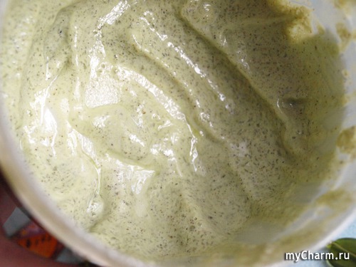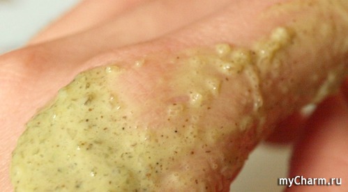 Скраб представляет собой светло-зеленую кашицу с вкраплениями. Скажем так, напоминает какое-то ведьмино зелье.