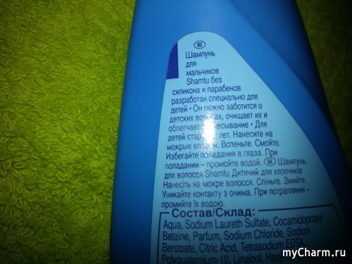 Что же касается детской линейки Шамту – я даже и не подозревала о ее существовании. Ну раз подарили – значит, познакомимся. Но для начала я сразу пробежалась глазами по составу и облегченно выдохнула: парабенов и силикона я там не обнаружила, да и пометка об этом есть на упаковке. Можно продолжать знакомство!