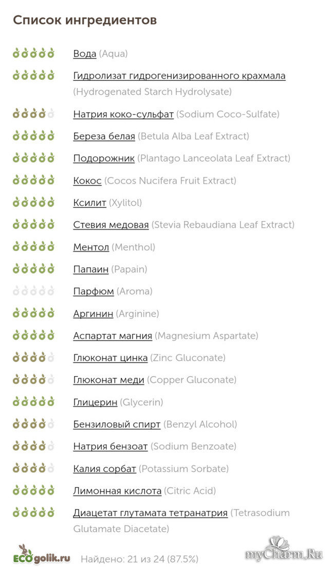 И если отсутствие красителей видно не вооруженным глазом: жидкость полностью прозрачная и имеет слегка зеленоватый цвет, который напоминает березовый сок, то для разбора состава средства я обратилась к сайту Экоголик.