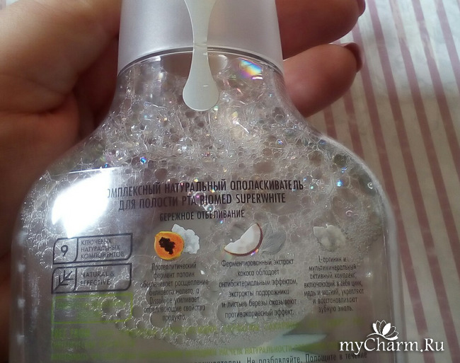 Состав, как видите, порадовал. Однако производитель предупреждает, что глотать жидкость нельзя. Кстати, глотать и не очень хочется - это я по собственному опыту сужу. Ополаскиватель имеет приятный нежный кокосовый аромат. И даже чуток кокосового привкуса во рту присутствует. Но в основном это "ядреная" свежесть и сбор трав, чуть горьковатый. Сначала ощущается именно их сильное воздействие, причем и на зубах и на языке. Прямо чувствуется что ополаскиватель работает и очищает. Пользоваться им легко и просто: набираю в рот и полощу зубки в течение минуты. Разбавления средство не требует. Затем сплевываю и наслаждаюсь свежестью во рту и на языке.