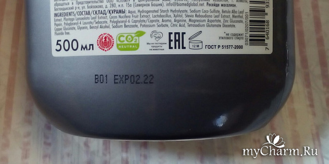 Объем ополаскивателя - 500 мл. Расход экономичный, поэтому одной бутылки хватает надолго. Для удобства применения, отвинчивающаяся крышечка сделана в форме стаканчика. Срок годности после вскрытия упаковки составляет 12 месяцев. Изготовлена продукция по ГОСТу и производитель Biomed не тестирует свои продукты на животных.