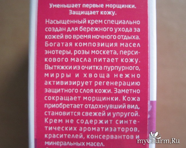 Розовый разглаживающий ночной крем имеет полностью органический состав, как, впрочем, и вся «веледовская» косметика. Никаких красителей, консервантов (парабенов), сульфатов, минеральных масел, отдушек и прочего.
