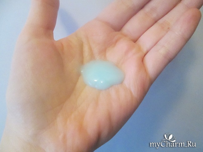 Остановлюсь немного на консистенции и цвете продукта. По своей текстуре средство напоминает средней густоты бальзам, не растекается по руке во время применения, распределяется по волосам чудесно. Цвет у продукта голубоватый, приятный. Аромат неяркий, но парфюм чувствуется.