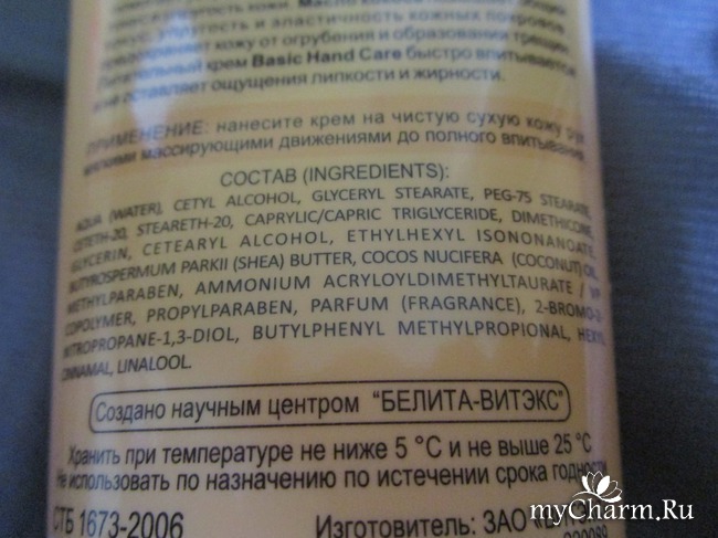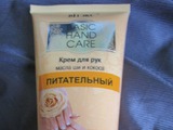 Сегодня я хочу поделиться с Вами впечатлениями о бюджетном Креме для рук с маслами ши и кокоса Питательном, который разработан научным центром "Белита-Витэкс". Именно этот крем выпускается под маркой "ВІТЭКС". Сразу бросается в глаза надпись, сделанная Caps Lock (заглавными буквами) на золотистом фоне "BASIC HAND CARE". Надпись означает "Основной (базовый) уход для рук.