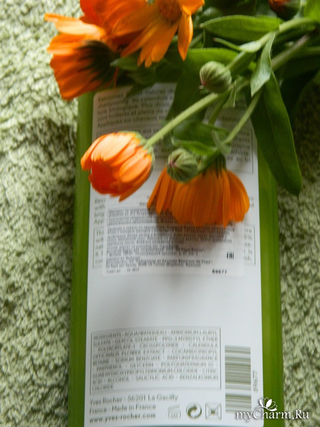 Флакон зеленого цвета с половинкой нарисованного цветка календулы – узнаваемый дизайн косметический продукции от Ив Роше. Отдельного упоминания заслуживает крышка – чтобы открыть ее, нужно приложить немало усилий. Во-первых, откидывающуюся часть не так-то просто подцепить, во-вторых, нужны особые ухищрения, чтобы поднять ее. Не знаю, для чего производитель так намудрил с крышкой (может, чтобы шампунь не проливался во время транспортировки, может, чтобы дети не открыли), но, по-моему, он явно переборщил. Хотя и в этом есть свой плюс – шампунь можно смело брать с собой в дальнюю дорогу и не бояться, что флакон откроется и средство прольется.