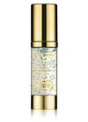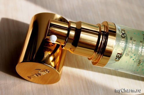 Продолговатый золотой колпачок снимается легко, а закрывается достаточно плотно. Под ним имеется удобный дозатор, тоже в золоте. Силой нажима можно корректировать подачу средства. Это может быть капелька-бусинка или капелька-горошинка. Очень удобно и позволяет экономно расходовать дорогой косметический продукт. А он, кстати, очень привлекателен внешне. Имеет желейную консистенцию, полупрозрачный с легким лимонным оттенком и зелеными микрокапсулками. Что же таит в себе этот чудо-состав?