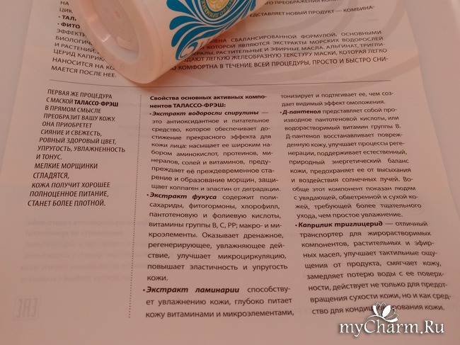 Во время процедуры кожа расслабляется, немного охлаждается – самый настоящий релакс. Маска немного стягивает кожу, но неприятными эти ощущения не являются. Если видите или чувствуете, что кожа стала уставшей и поблекла, то «Талассо-фреш» - одно из лучших средств, чтобы за быстрые сроки сделать ее свежей и отдохнувшей.