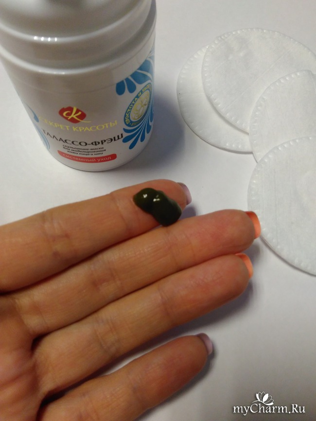 Как уже понятно составу, маска «Талассо-фреш» имеет гелеобразную консистенцию. Она достаточно липкая, поскольку является еще и альгинатной. Поэтому я рекомендовала бы заранее подготовить спонж для умывания либо несколько ватных дисков (штук 5-6) – это понадобится для удобства смывки средства. Распределяется маска без проблем. Ее аромат – свежий, водорослевый – мне очень нравится.