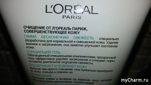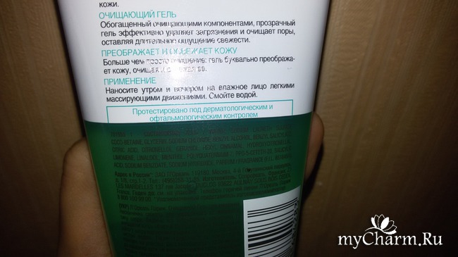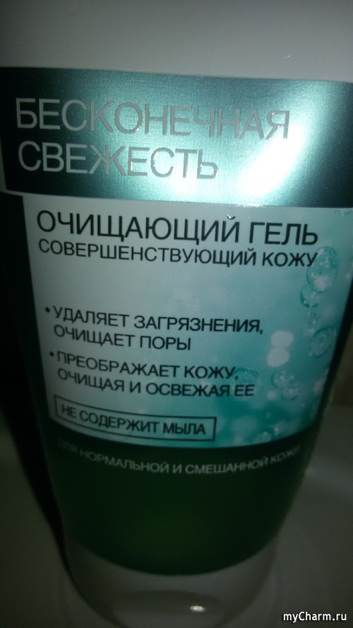 Четкий и в меру крупный шрифт отлично воспринимается и читается. Производитель сразу делает ставку на максимализм, заявляя, что этот гель, «совершенствующий кожу», дарит «бесконечную свежесть». Кстати, слово «очищающий» и его однокоренные варианты на лицевой стороне упаковки упомянуты аж три раза.