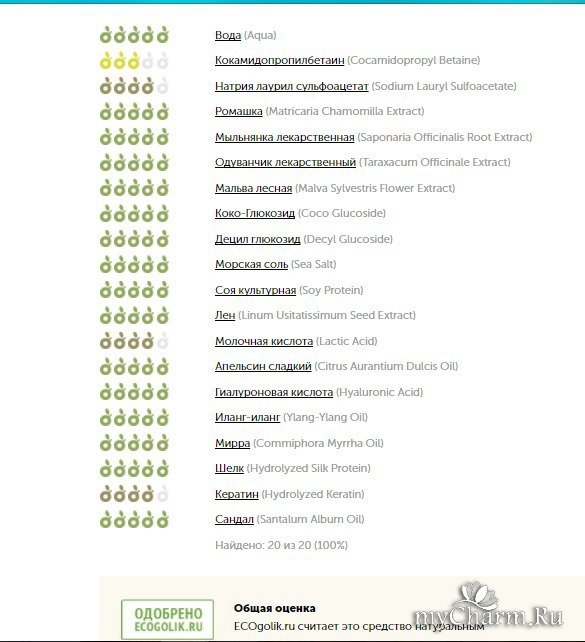 Состав шампуня я проверила через специальный сервис. Экоголик считает это средство натуральным.