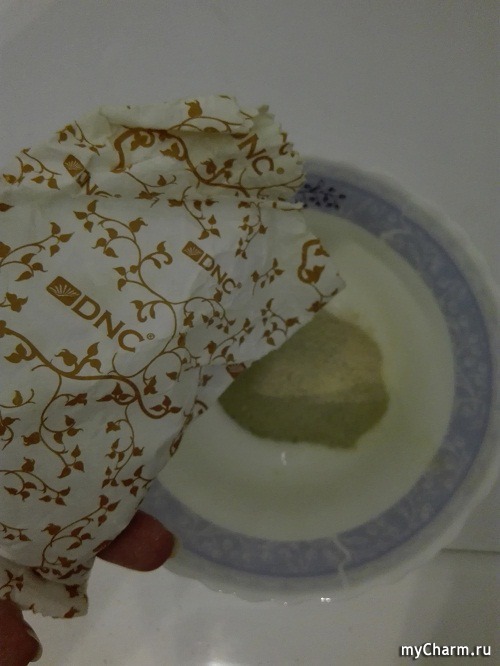 Глина упакована в пакетик, сверху на ощупь он бумажный и расписан красивым орнаментом и конечно украшен логотипом DNC. Когда глина в сухом виде, она имеет желтый оттенок, достаточно сыпучая.