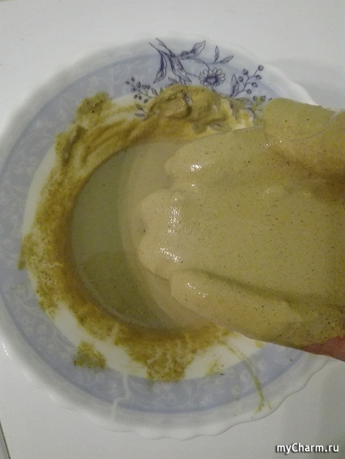 Смешиваю с теплой водой, и глина становится более яркой, песочного цвета. Приятный желтый цвет радует глаз, все-таки светлыми масками приятнее пользоваться, чем намазывать себя темной глиной.