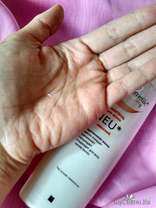 Шампунь можно назвать бесцветным. На фото его едва заметно.