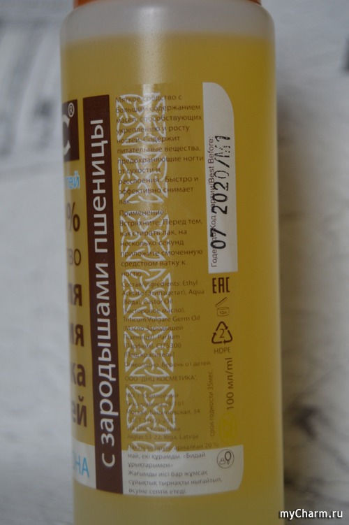 Средство выпускается в полупрозрачном пластиковом флаконе объемом 100 мл. На лицевой стороне большими буквами указано название и производитель. Отдельно вынесено на главную, что продукт без ацетона, что определенно радует.