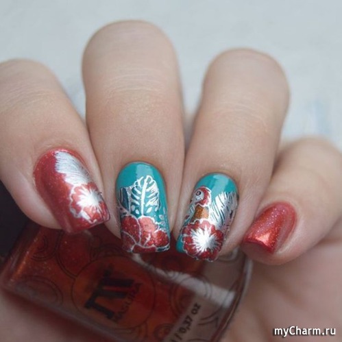 Мне очень понравилось, что масло имеет такой прекрасный состав, поэтому и проверить его силу в снятии лака я решила на шиммерном лаке, к тому же и на маникюре с реверсивным стемпингом. Ведь если он справится с таким сложным покрытием, то обычное однотонное будет ему тем более по плечу. Итак, вот такое покрытие мне предстояло снять: