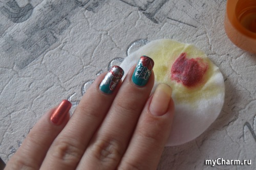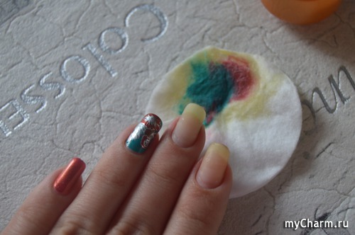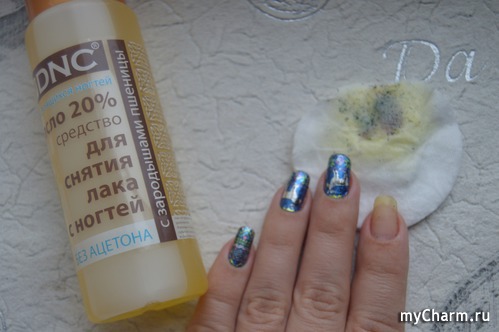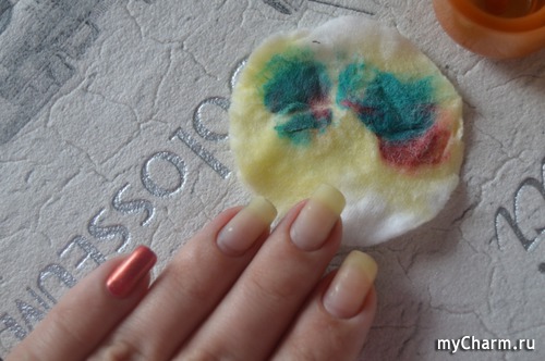 Ну, и совсем сложное испытание, которому я решила подвергнуть масло, это снятие фольгированных слайдеров (бренд "Артмикс", серия Luxury), но и тут результат оказался прекрасным. Тут потребовалось уже 2 ватных диска, но все же покрытие отлично снялось. Главное, хорошенько пропитать его.