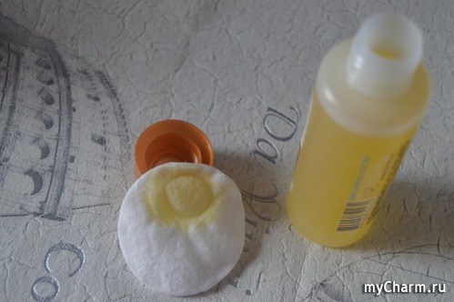 На горлышке средства нет дозатора, но так и проще промокнуть ватный диск именно составом (его ж надо взболтать), чтобы на него и масло попало. Получается достаточно большая площадь диска, которой в итоге мне хватило на 2 ногтя.