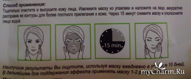 Перед применением нужно очистить кожу лица привычным для вас средством от загрязнений и косметики. Извлечь из упаковки тканевую маску и наложить ее на сухое лицо. С маской необходимо быть в течение 15-20 минут, после чего снять и вымыть лицо водой. Производитель советует для наилучшего результата пользоваться маской ежедневно в течение десяти дней.