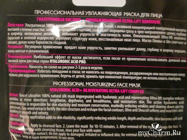 Производитель рекомендует применять маску не одноразово, а регулярно. Через две недели еженедельного курса с этой маской можно будет заметить видимые изменения состояния кожи. Она станет более упругой, морщинки сократятся. При этом кожа будет постоянно мягкой и увлажненной, пока маска будет в косметическом обиходе своей владелицы.