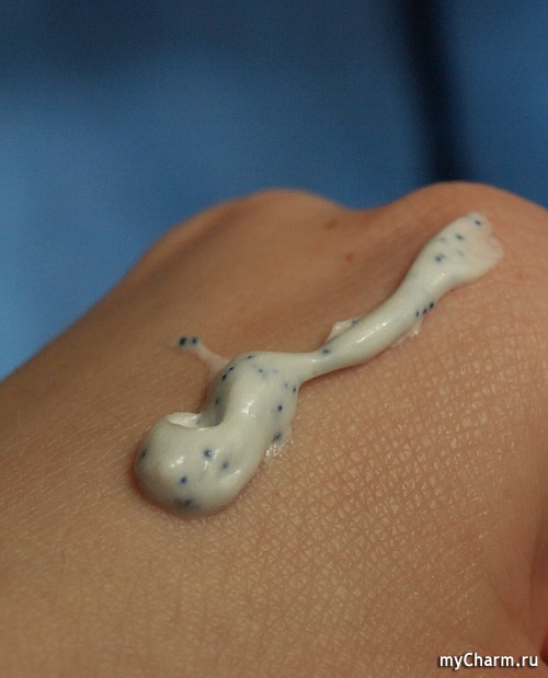 Средство плотненькое белого цвета. Ну крем как крем. В нем так же присутствуют синие гранулы. Все это очень похоже на зубную пасту))