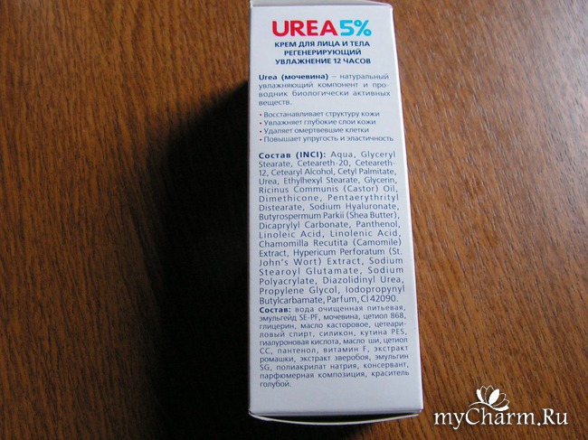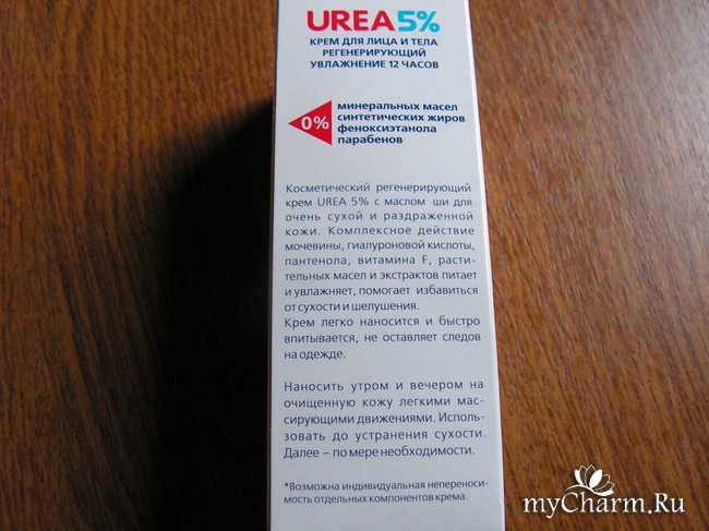 Если кто-то сталкивался с продуктами, содержащими мочевину (UREA), знают, что данная ухаживающая косметика в первую очередь предназначена для сухой и очень сухой кожи, требующей увлажнения, регенерации и восстановления. Urea (мочеина) – является натуральным компонентом, который прекрасно увлажняет, и способствует скорейшему усвоению питательных веществ кожей. Поэтому крем, где мочевина содержится в сочетании с не менее полезными ингредиентами, такими как гиалуроновой кислотой, маслом ши, касторовым маслом, витамином F, пантенолом, экстрактом зверобоя, экстрактом ромашки, будет творить с кожей совершенные чудеса. В чем я на собственном опыте и убедилась!
