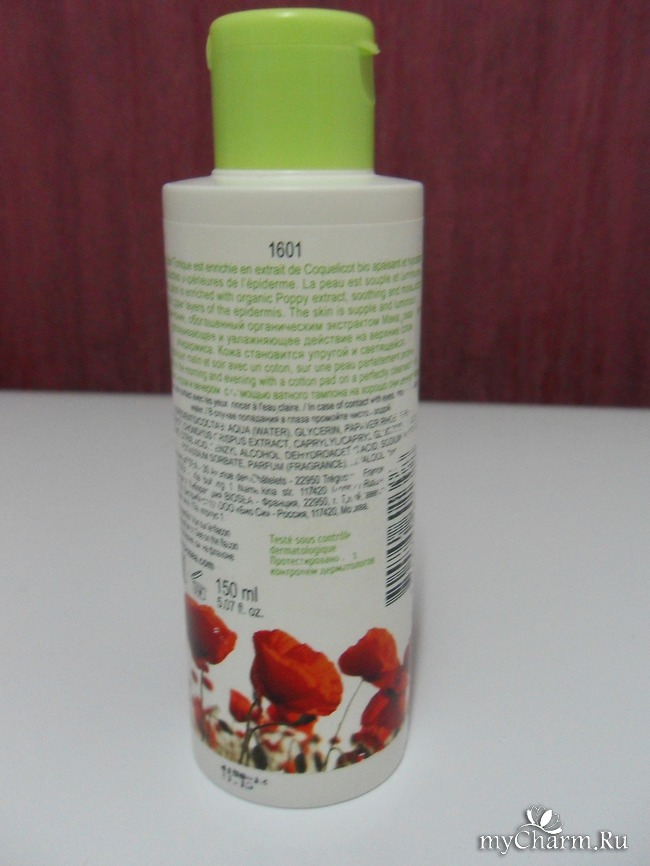 Состав с флакона практически уже стерся. Но ничего опасного лосьон не содержит. Обещанный экстракт мака стоит третьим в списке – он обладает успокаивающим свойством. Кроме того, в составе есть Chondrus crispus extract – экстракт красных водорослей. Как я прочитала в интернете, это отличное увлажняющее средство.