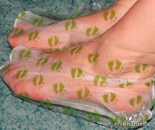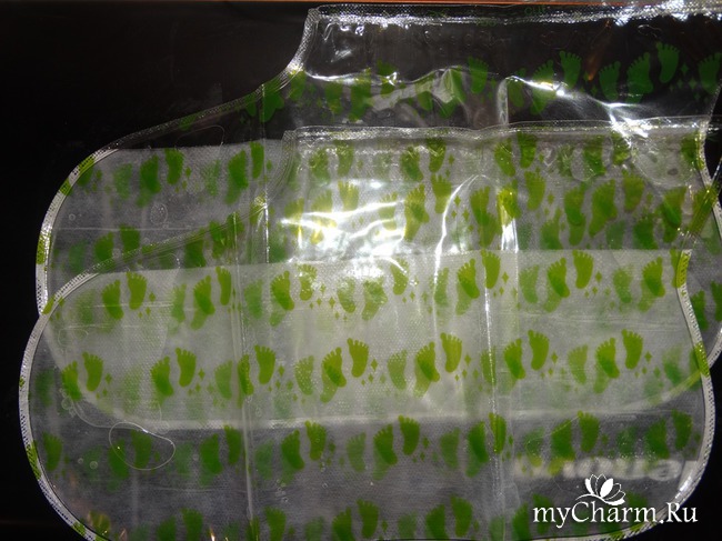 Заглянув внутрь упаковки, я обнаружила два носочка (если их так можно назвать), на внешней стороне которых нарисованы зеленые ножки. А если точнее, два пакета в форме носков, внутри которых пропитанные химикатами следочки.