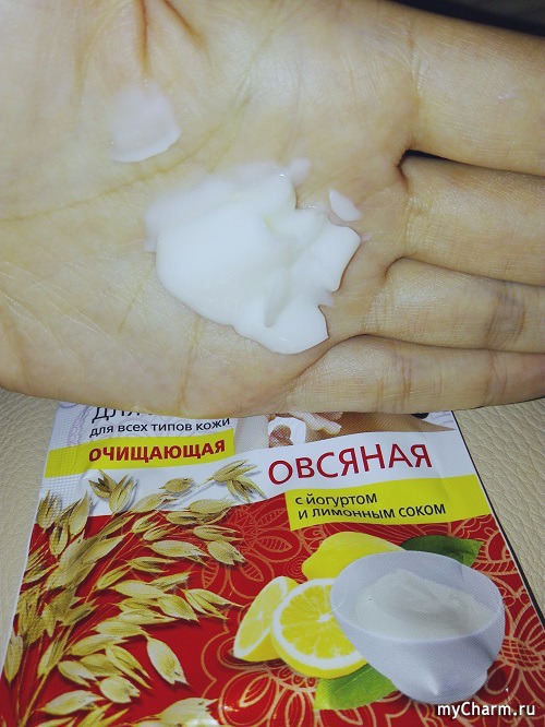 Активные компоненты маски – это овсяные хлопья, йогурт, лимонный сок.