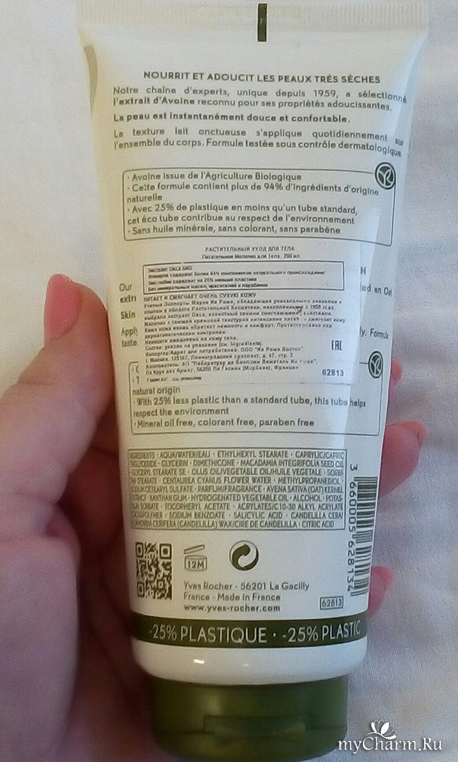 Изготовлено молочко во Франции. Производитель АО "Лаборатуар де Биоложи Вежеталь Ив Роше". Вся информация на упаковке изложена на французском языке. Но и о российском потребителе позаботились: на обороте тюбика наклеена этикетка с русским переводом, содержащим всю самую необходимую информацию для нас - пользовательниц. Правда настолько мелким шрифтом, что приходится основательно вчитываться.