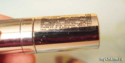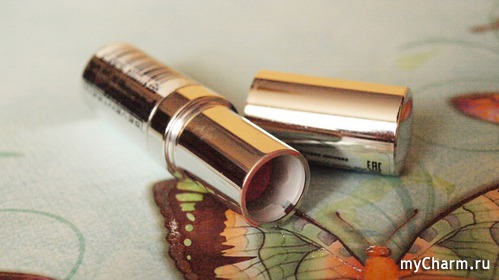 На донышке написаны номер и название, с боков налеплены прозрачные наклейки с информацией о помаде и составе, написанной жутко нечитабельным шрифтом.