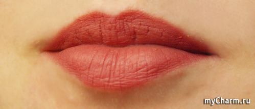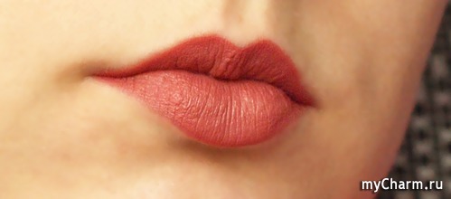 • Матовый финиш. Помада действительно совершенно матовая, а не сатиновая. Первые минут пять после нанесения имеет сатиновый финиш, но после того как «усядется», становится матовой.