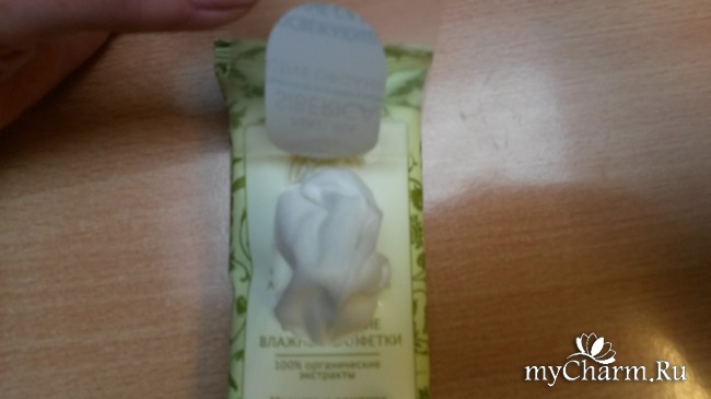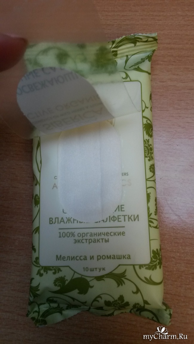 В маленьком пластиковом пакете оказались десять штук воздушных, влажных салфеток с еле уловимым запахом свежести и трав. Как оказалось, это мои любимые мелисса и ромашка. Салфетка идеально все почистила, оставила легкий, приятный запах. Я резкую пропитку не приветствую, потому как не нравится, когда навязчивый запах не выветривается.