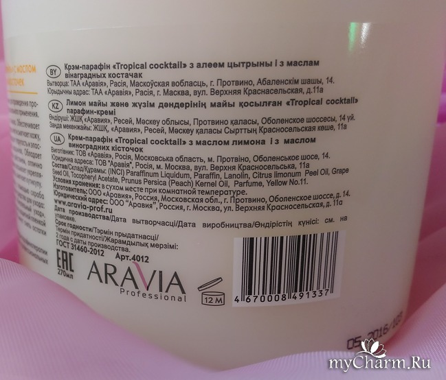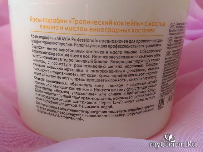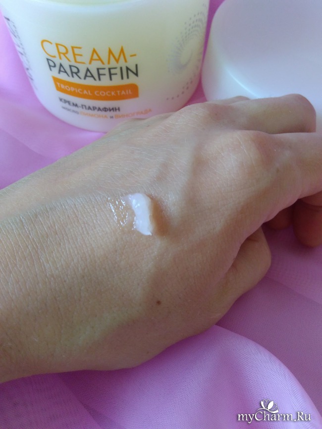 Время идет вперед, и парафинотерапия тоже стала доступной для всех. Представляю вам крем-парафин «Тропический коктейль» с маслом лимона и винограда, который я получила на тестирование.В чем особенность этого средства? Эффект, получаемый от крема подобен сеансу парафинотерапии, а вот использование намного проще, чем при обычной процедуре с применением парафина. Крем не нужно греть, он наносится непосредственно на кисти или стопы, укутывается пленкой и чем-то теплым. Через 15-20 минут остатки средства удаляются бумажным полотенцем, и мягкость кожи вам обеспечена. Согласитесь, очень удобно?