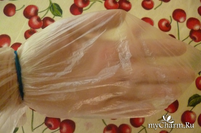 Далее быстро надеваю на руки обычный целлофановый пакет (можно тщательно обмотать пищевой пленкой).