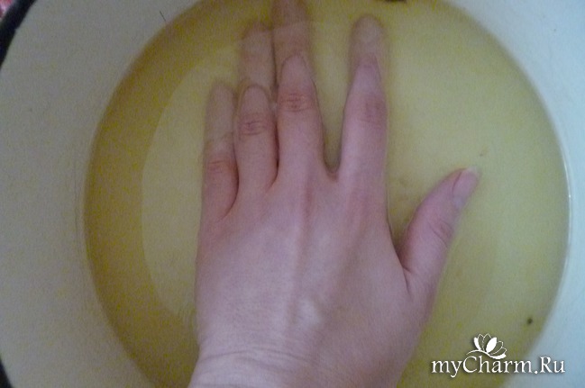 В горячую жидкость постепенно, не спеша помещаю кисть руки.